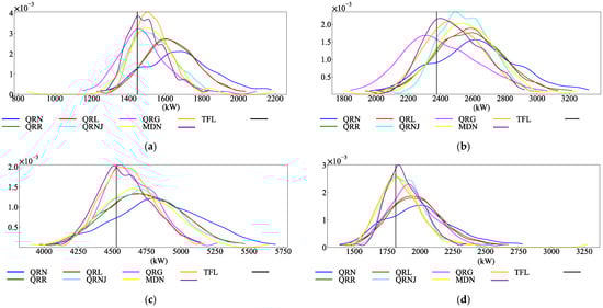 Probability density prediction results of each model: (a) Entirety of forecast. (b) Work day forecast. (c) Weekend forecast. (d) Holiday and festival forecast.