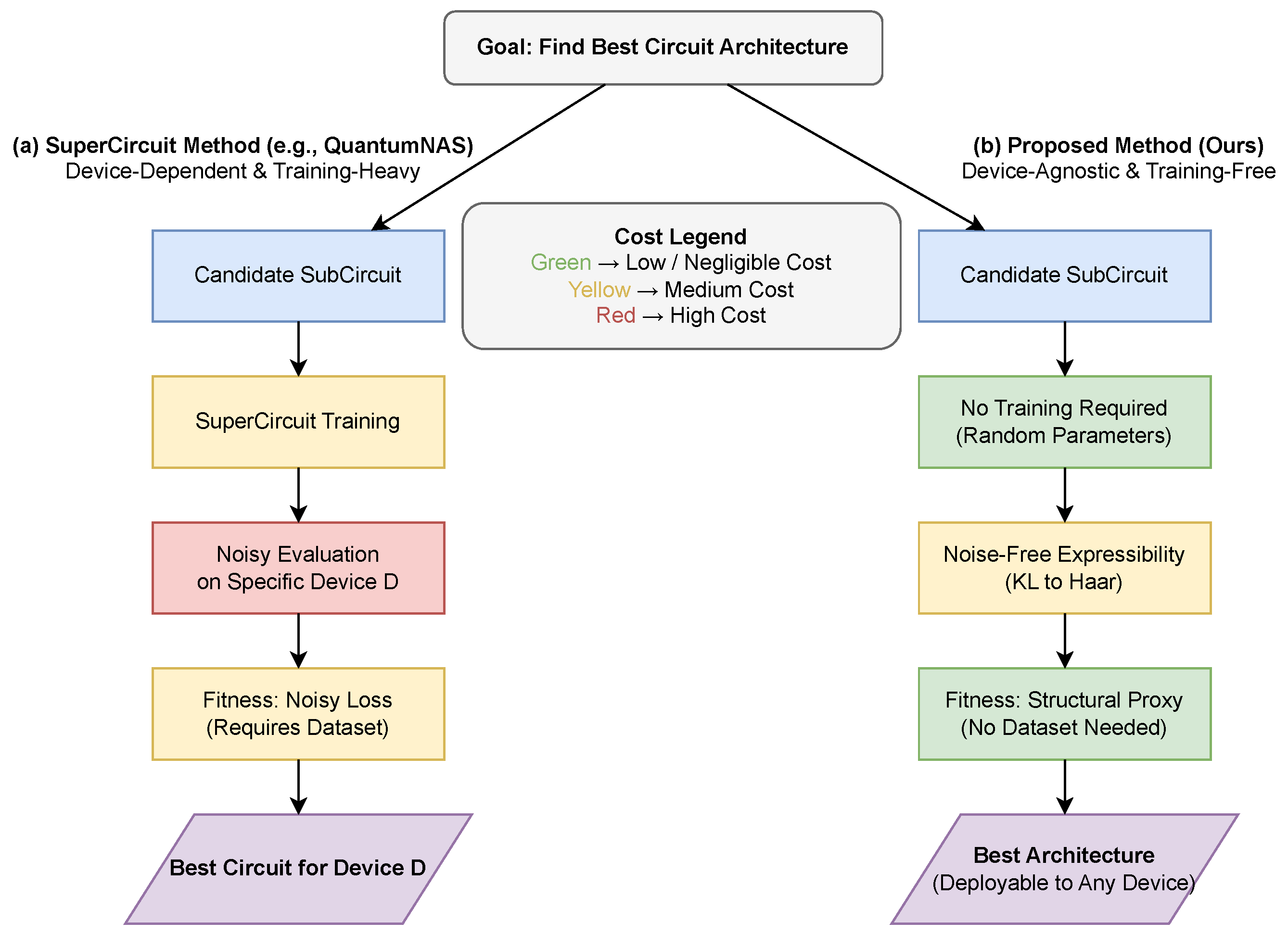 Conceptual comparison of evolutionary quantum architecture search pipelines. (a) SuperCircuit-based methods (e.g., QuantumNAS) rely on training a large SuperCircuit and evaluating SubCircuits via inherited parameters under noisy execution on a specific device, resulting in high training and evaluation cost and device-dependent search. (b) The proposed expressibility-guided approach uses a noise-free training-free structural proxy based on circuit expressibility to guide architecture ranking, reducing the need for repeated noisy performance evaluation during search and enabling device-agnostic discovery without dataset access. Colors indicate relative computational cost: red (high), yellow (medium), and green (low).