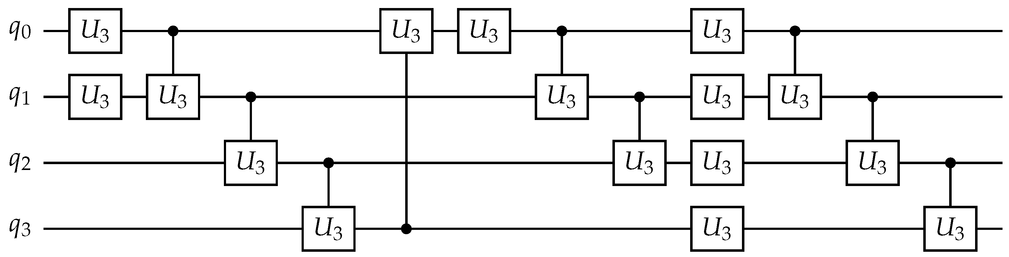 - Cerezo, M.; Arrasmith, A.; Babbush, R.; Benjamin, S.C.; Endo, S.; Fujii, K.; McClean, J.R.; Mitarai, K.; Yuan, X.; Cincio, L.; et al. Variational quantum algorithms. Nat. Rev. Phys. 2021, 3, 625–644. [Google Scholar] [CrossRef]