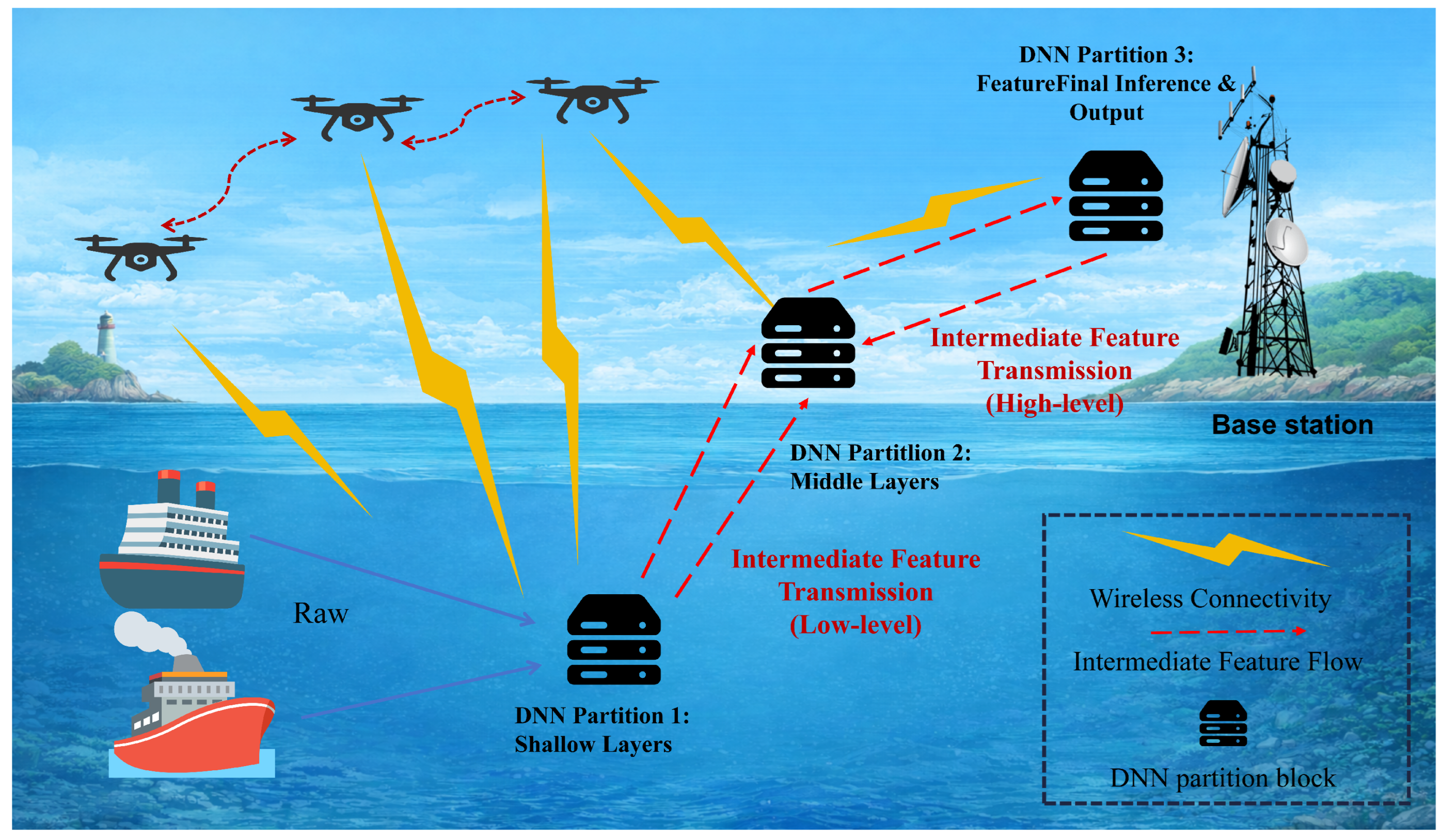 - A UAV-assisted MEC architecture is proposed to minimize task execution latency while maximizing completion rates in SAGSIN. Specifically, the framework addresses the resource constraints of intelligent terminals by leveraging UAV-mounted servers. The architecture decouples the complex non-convex optimization problem into two tractable subproblems, the bandwidth allocation strategy for UAVs and the DNN model partitioning for terminals.