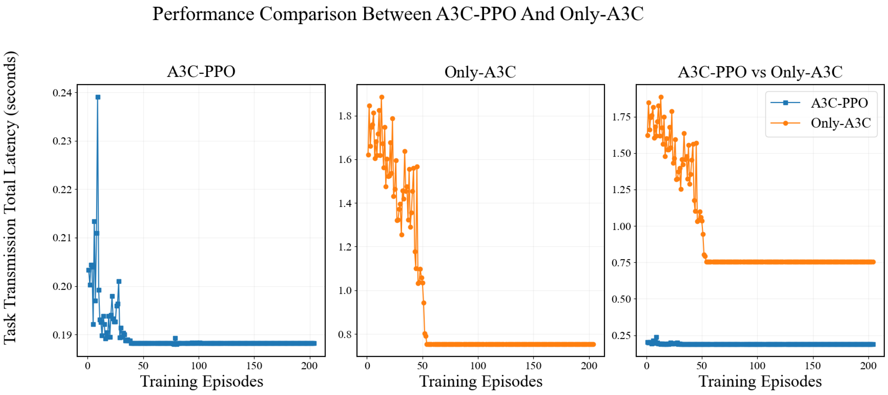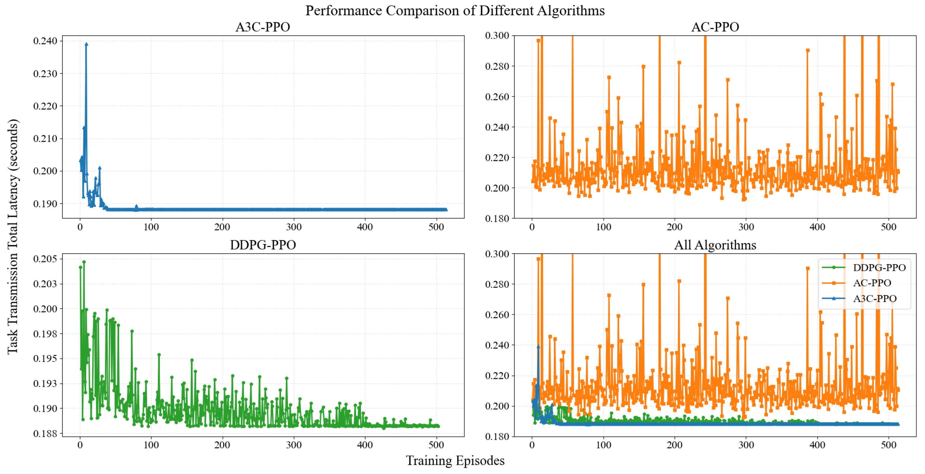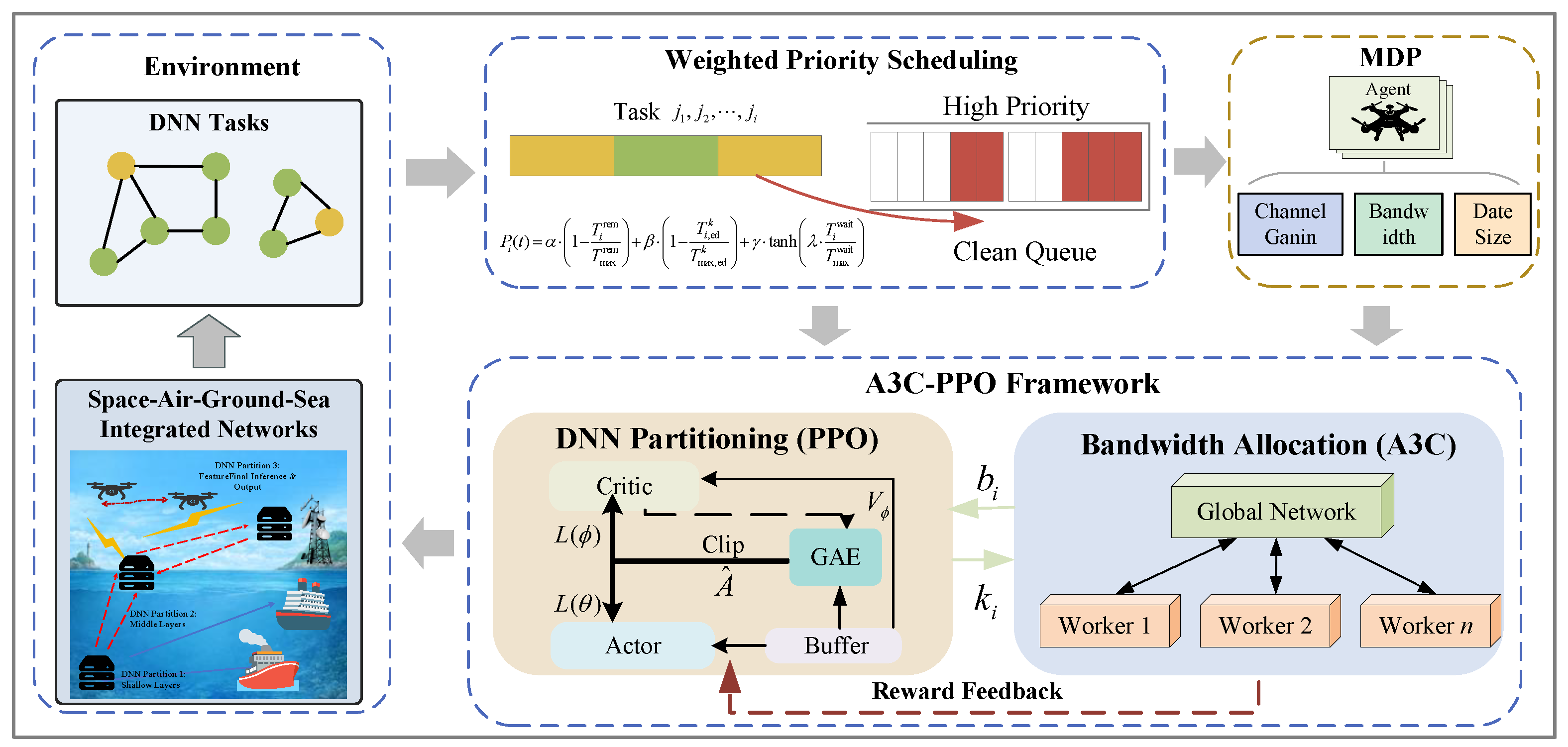 - A hybrid optimization framework integrating A3C and PPO is proposed for SAGSIN. Heterogeneous temporal dynamics and structural requirements of bandwidth allocation and DNN partitioning are explicitly recognized. High-frequency adaptation to channel fluctuations is handled by the asynchronous architecture of A3C. Stable topology-aware discrete decisions are governed by the clipped objective function of PPO. Rapid convergence in dynamic environments and robust generalization across model topologies are achieved. The scenario-driven algorithm assignment is fundamentally distinguished from generic decomposition strategies.
