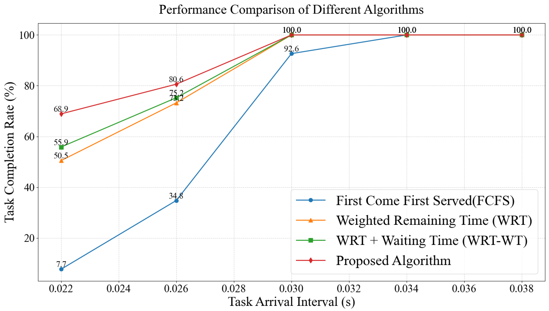 - Based on the above framework, the proposed scheduling algorithm quantifies task priority by integrating computation time and remaining available time. Through the dynamic calculation of priority, urgent tasks are guaranteed execution resources, while short tasks are prioritized according to the Short-Job-First principle, avoiding resource monopolization by long-duration tasks that causes service timeouts.