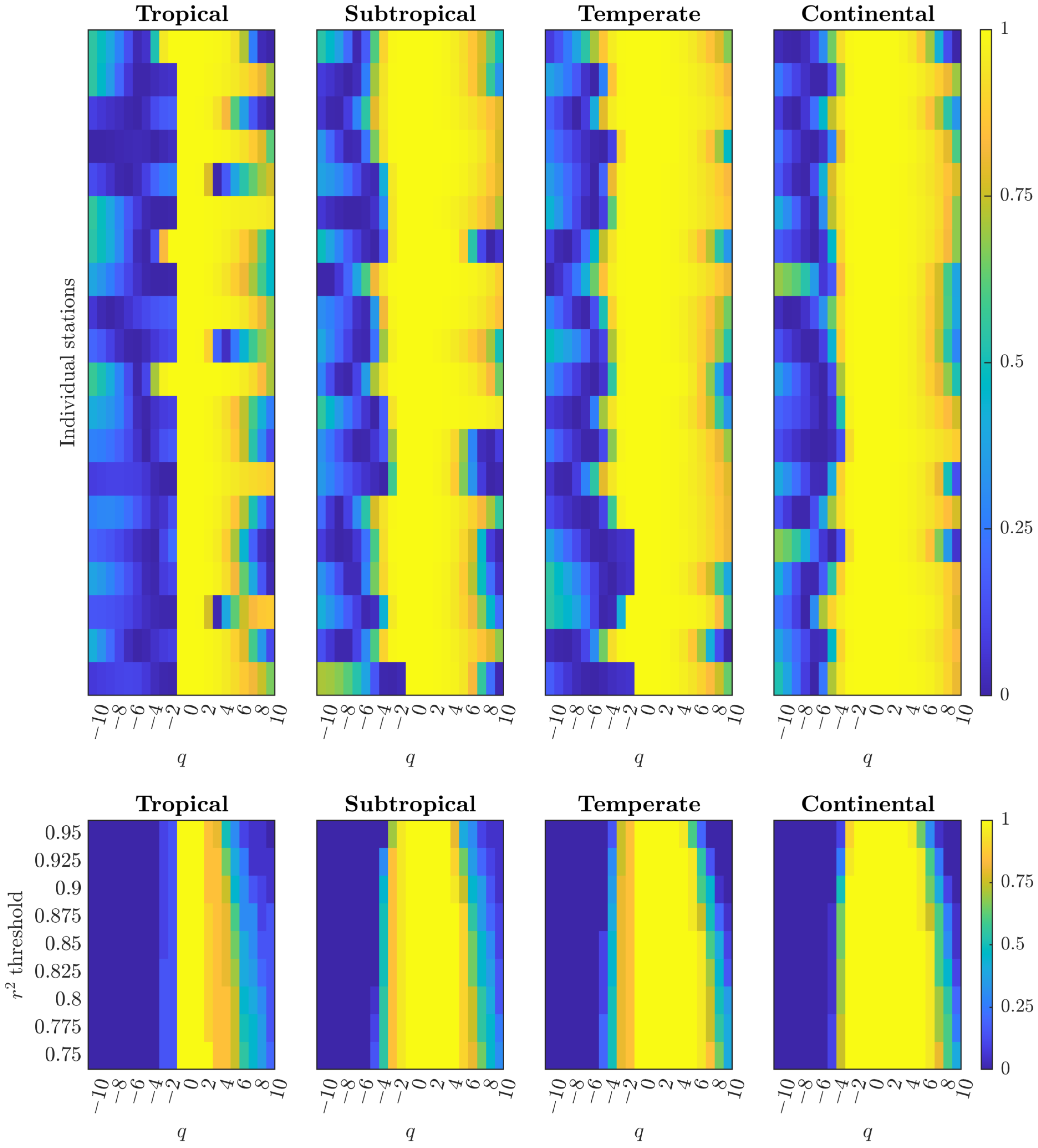 q (daily fluctuations)—mirrors cardiac dynamics and mature financial markets. Geographical variations reflect differences in atmospheric forcing complexity (synoptic activity in higher latitudes versus tropical stability), not differences in fundamental cascade type [