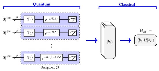 where is a discrete time step and d denotes the chosen subspace dimension [14]. Instead of estimating Hamiltonian matrix elements through controlled measurements, SKQD samples bitstrings directly from the Krylov states on the quantum device. The collected samples define a reduced configuration space, in which the Hamiltonian is projected, and subsequently diagonalized using a classical computer, obtaining approximations of the low-energy eigenvalues and eigenstates [14]. Figure 1 illustrates the workflow of the SKQD approach.