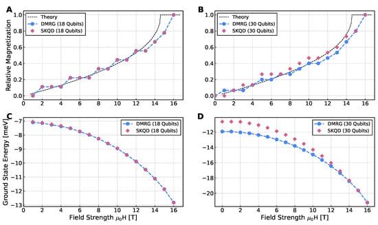 Figure 4A,B show the magnetization of CuPzN reconstructed with SKQD on 18- and 30-qubit IBM Heron quantum processor. Across the entire field range, SKQD closely follows the Bethe ansatz reference curve, including the nonlinear rise in the intermediate-field region and saturation near the critical field. This agreement is notable because the low-field isotropic regime corresponds to the hardest region in the sparsity diagram, see Figure 2, where the ground state is highly delocalized.