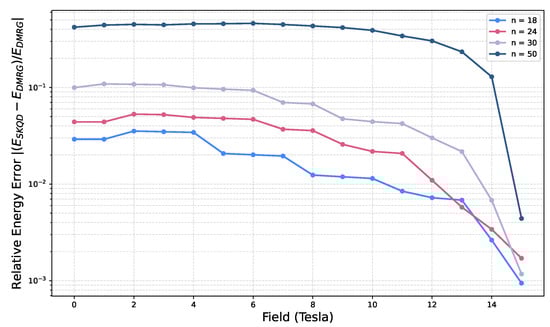 The energy estimates in Figure 4C,D further validate the performance of SKQD. For 18 qubits, SKQD tracks DMRG with excellent accuracy. For 30 qubits, deviations appear in the weak-field regime, consistent with reduced sparsity and increased sampling demands, but systematically diminish as the external field polarizes the ground state. As seen in Figure 2, weaker fields place the system in a challenging regime for SKQD, , which implies increasing classical postprocessing demands as the system size grows. The Inverse Participation Ratio map in Figure 2 provides a unified explanation of the behavior of SKQD. Accuracy is reduced in low-field, isotropic regions where the ground state is highly entangled and non-sparse, but improves distinctly as either field strength or anisotropy increases. To explicitly quantify these boundaries and assess the algorithm’s scalability, we present the relative energy error, , across multiple system sizes in Figure 5. In the highly entangled weak-field regime (<4 T), the sampling overhead becomes a bottleneck, and the error scales noticeably with system size, reaching approximately 30–40% for . Conversely, as the field strength surpasses 10 T and the system shifts toward the sparse, polarized regime, the relative error for all system sizes drops sharply toward a high-accuracy baseline (<). This quantitative scaling directly mirrors the theoretical Inverse Participation Ratio transitions previously established in Figure 2. To extract magnetization on hardware, we employ a magnetization sector sweep using W-state initializations tailored to each conserved particle number. Post-selection on excitation number (Appendix B) is critical: although incorrect bitstrings do not affect the minimum-energy estimate, they bias magnetization. Filtering restores correct sector ordering and yields smooth and physically accurate curves.