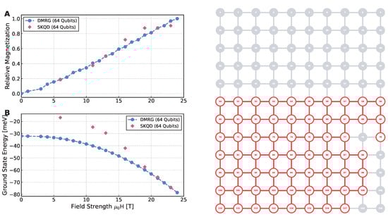 Motivated by the availability of the IBM Nighthawk Quantum processor, which features four-nearest-neighbor square lattice connectivity, and to assess performance beyond 1D, we apply SKQD to a 6 × 4 square lattice using a shallow snake-like singlet initialization; see Figure 6. Despite the increased connectivity of the lattice and the dense ground-state structure, SKQD reproduces the overall monotonic dependence of the ground-state energy on anisotropy and captures the correct qualitative trends when compared with exact diagonalization across much of the range. Agreement improves toward the Ising limit, consistent with the sparsity trends observed in one dimension. As a final demonstration, we characterize the magnetization process of an spin- lattice by tracking the evolution of the ground-state energy and longitudinal magnetization under an external field. The system is modeled after the coordination polymer , a quasi-2D Heisenberg anti-ferromagnet with an isotropic coupling constant meV [23]. Results can be seen in Figure 7. Although hardware noise and the high density of states near the zero-field limit lead to quantitative deviations from DMRG benchmarks, SKQD reproduces the correct qualitative behavior of the magnetization curve. These findings suggest that advanced post-processing techniques could further refine these estimates, potentially reducing the sampling overhead while improving the fidelity of the effective Krylov subspace. Such developments will be critical for scaling SKQD to larger 2D architectures on near-term noisy devices. These results indicate that SKQD can be extended to higher-dimensional lattice geometries while retaining qualitatively reliable performance in the high field regime.