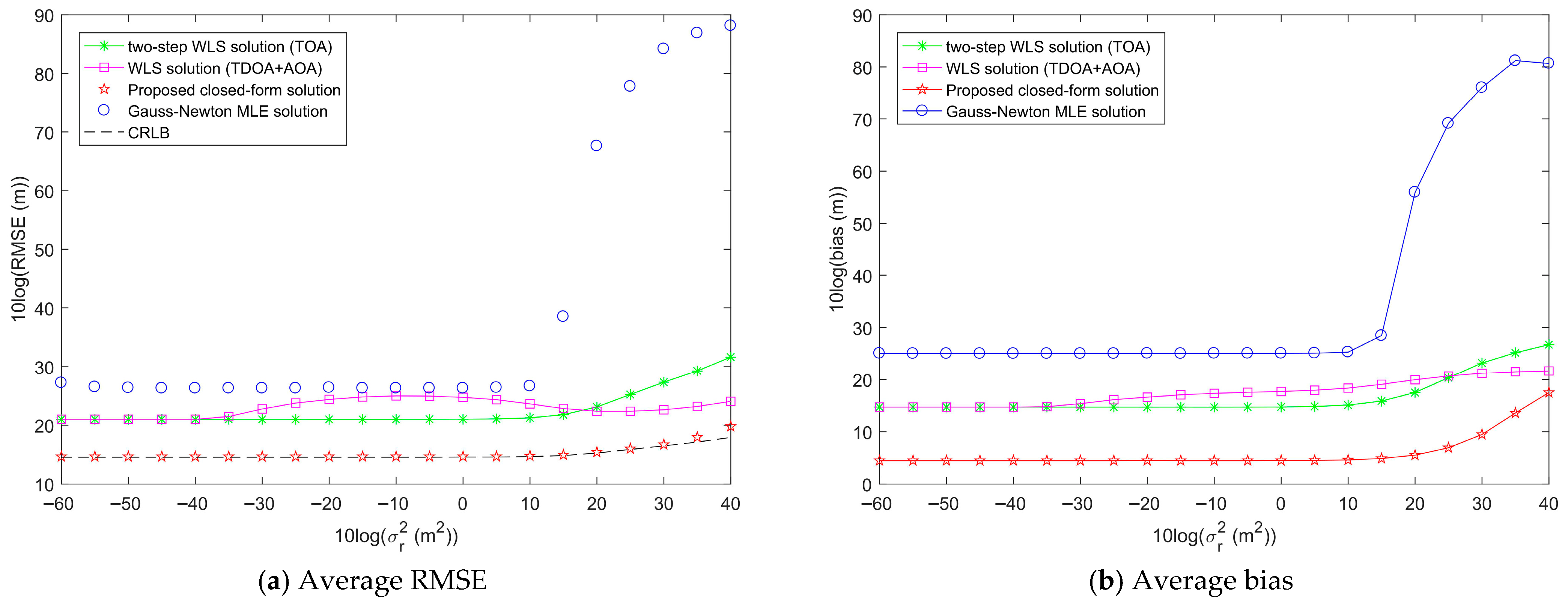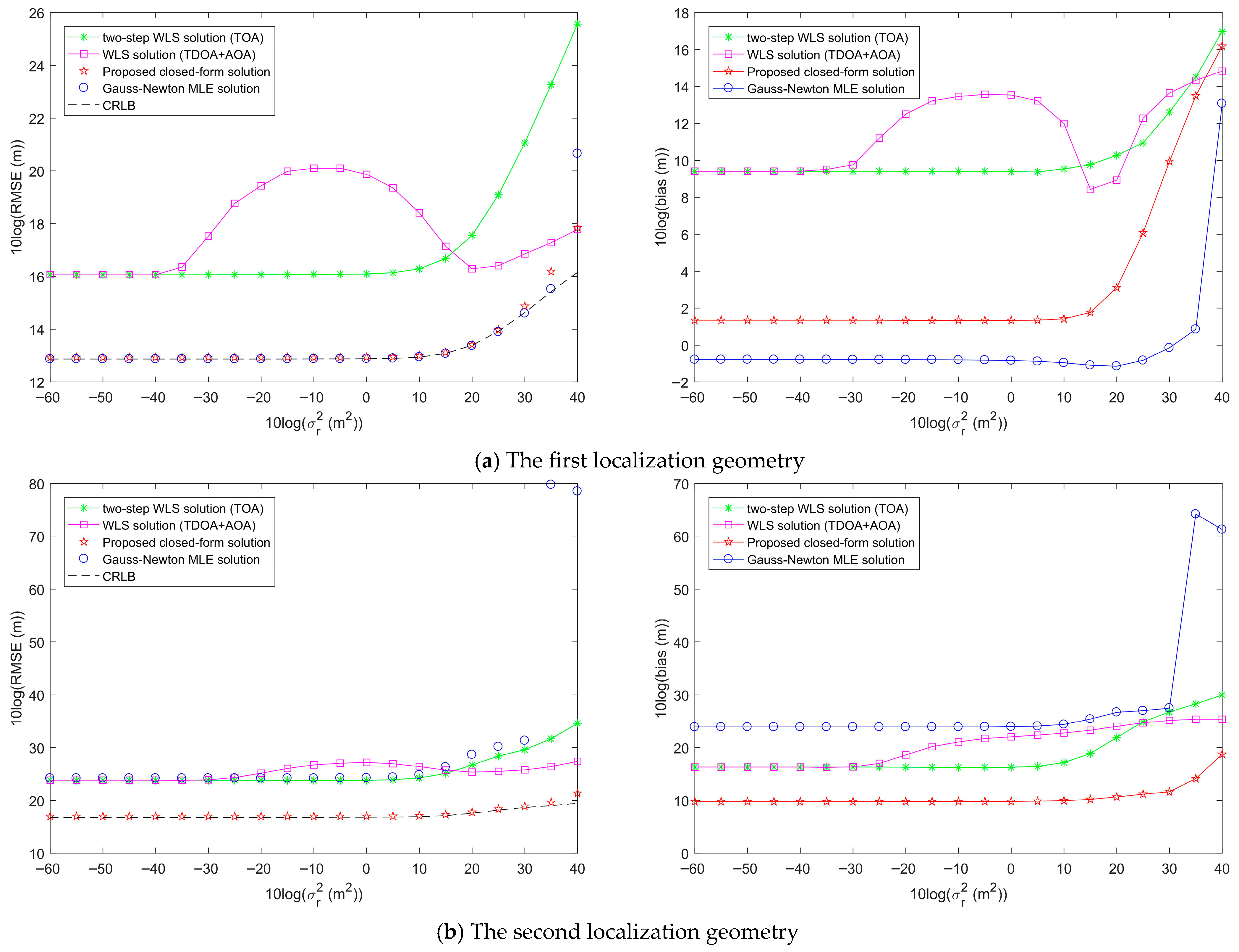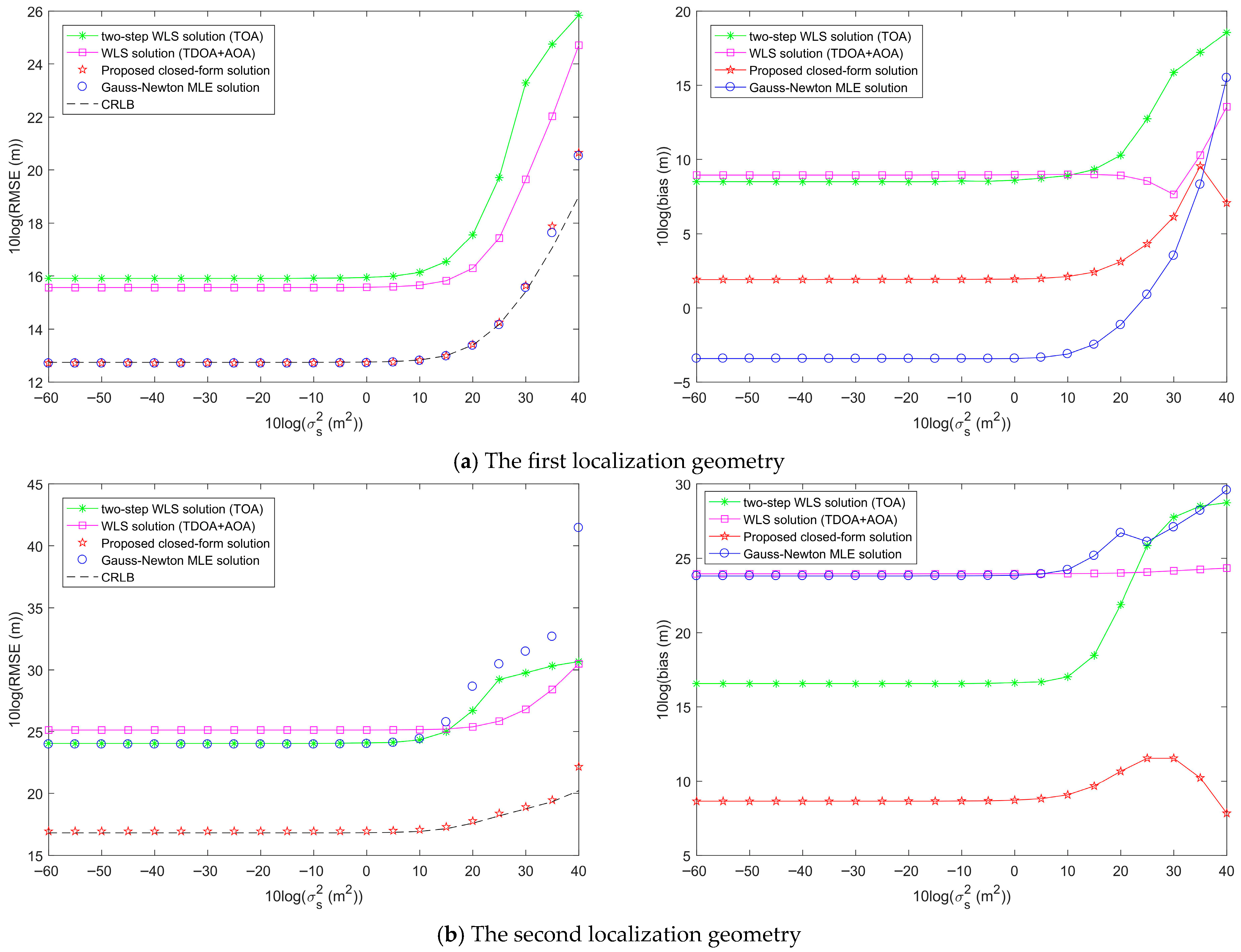 - Chen, S.; Ho, K.C. Achieving asymptotic efficient performance for squared range and squared range difference localizations. IEEE Trans. Signal Process. 2013, 61, 2836–2849. [Google Scholar] [CrossRef]