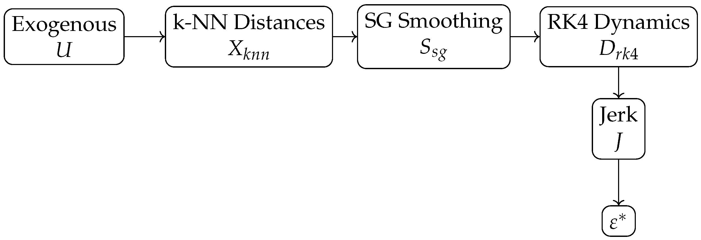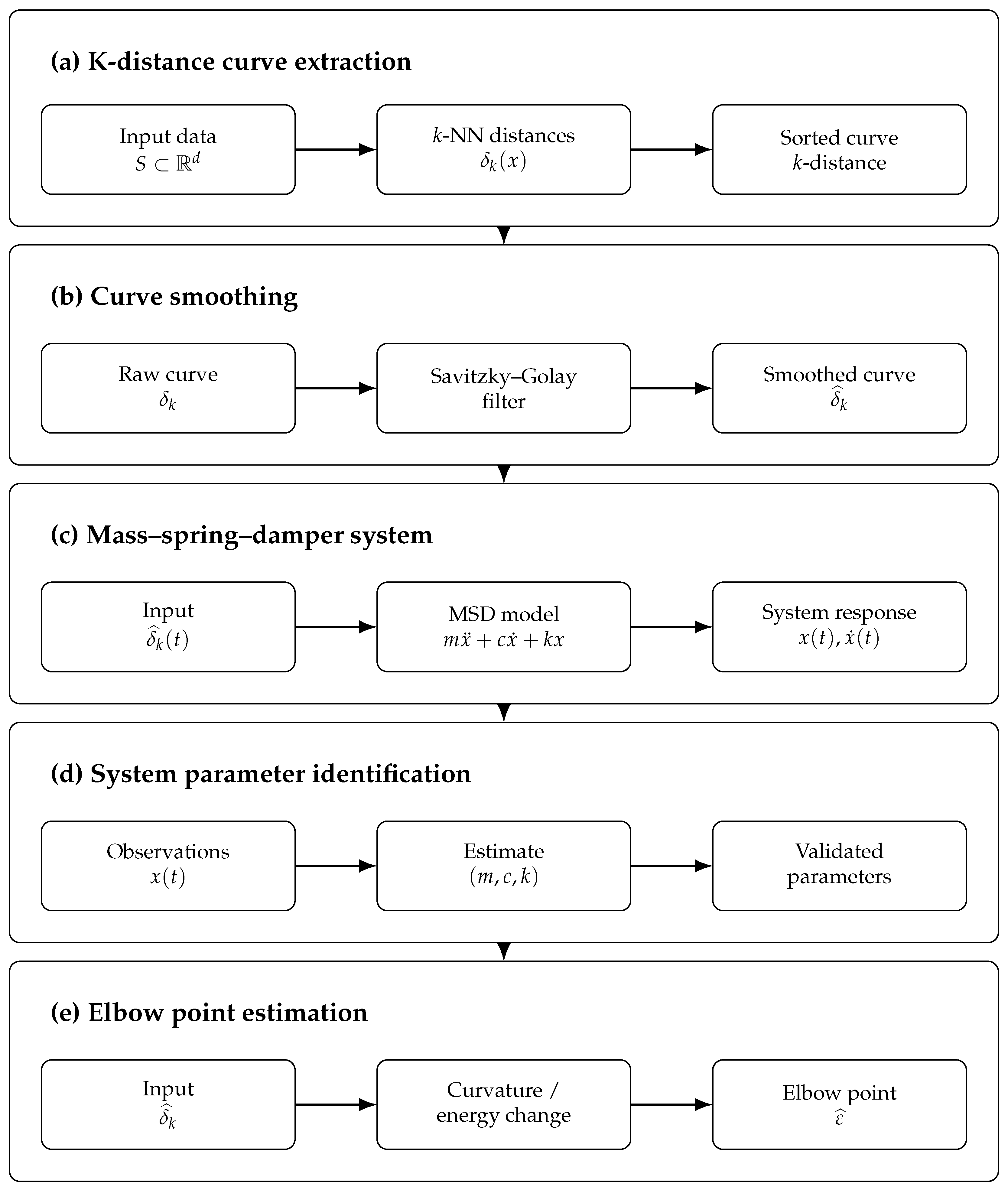 This algorithmic sensitivity motivates the modeling step adopted in the present work. Rather than treating the ordered k-distance curve solely as a geometric heuristic, the proposal approximates it with a surrogate dynamical layer to identify structurally relevant transitions. At this stage, however, the role of the dynamic formulation is representational: it provides a structured approximation of the ordered signal and should not yet be interpreted as a causal claim about the data’s physical origin.