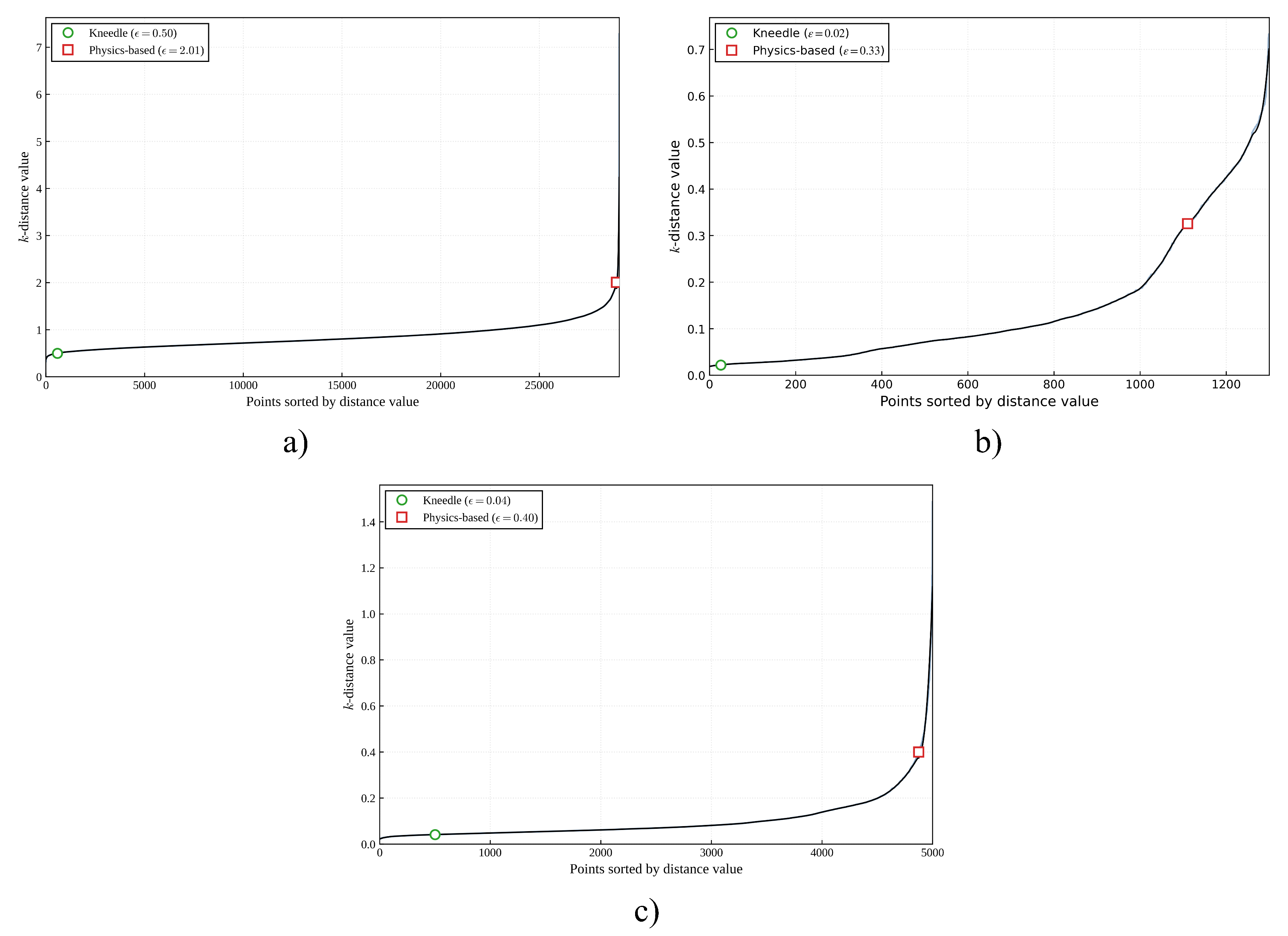 k-distance graph was calculated for all datasets using Nearest Neighbors, showing that the proposed dynamical formulation identifies a candidate transition region for threshold selection. Next,