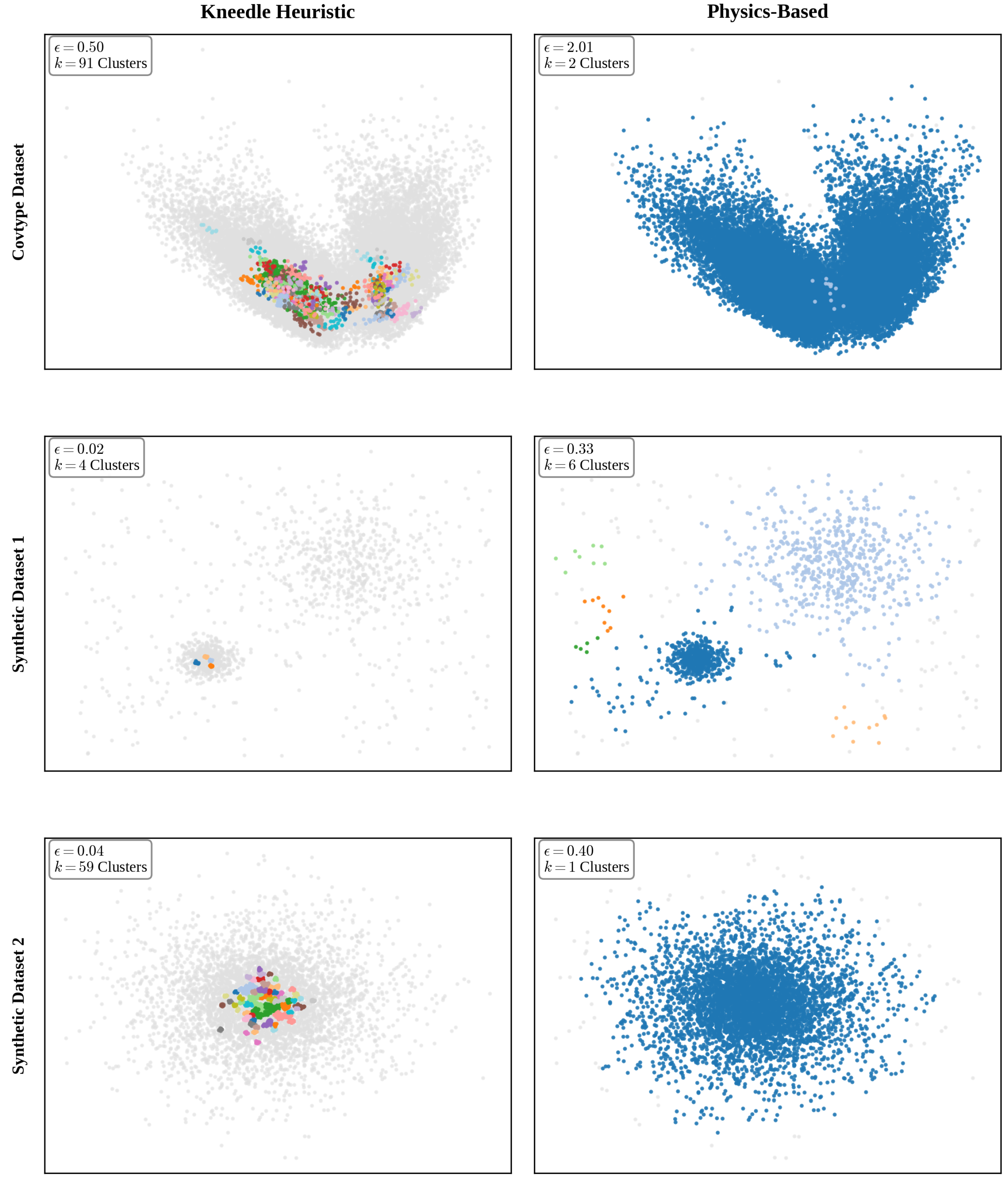 within standard DBSCAN. For this reason, the most appropriate baseline is not HDBSCAN, but the geometric heuristic commonly used for the same estimation task, namely Kneedle.