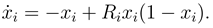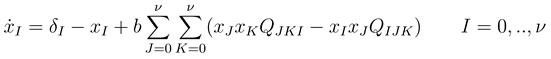 We have δ0 = 1 and δI = 0 for I > 0; thus all individuals are born not knowing any of the words. Individuals die at a constant rate, which we set to 1, thereby defining a time scale. The quantities QIJK denote the probabilities that individual I learning from J will become K. Eq (4.12) can be studied analytically if we assume that in any one interaction between two individuals only a single new word can be acquired and if words are memorized independently of each other. Thus the acquisition of the internal lexicon of each individual proceeds in single steps. The parameter b is the total number of word learning events per individual per life-time. In this case, we obtain for the population dynamics of xi, which is the relative abundance of individuals who know word Wi: