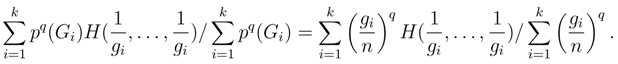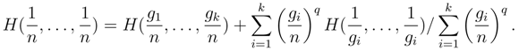 The case q = 1 means to take the usual average. On the other hand, we have the uncertainty in choosing one group Gi from k groups, that is H(g1/n,…,gk/n). When we impose the additivity of the uncertainty, the uncertainty in choosing directly from the source S with equal probability H(1/n,…,1/n) can be provided as the sum of the two uncertainties,