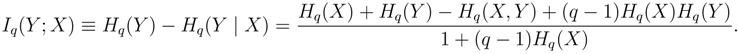 In order to be in consistent with the usual additive mutual information, we impose non-negativity for it. It also converges to the usual mutual information I(Y ; X) = H(Y) − H(Y | X) = H(X) + H(Y) − H(X,Y ) in the additive limit(q → 1). The mutual information of a random variable with itself is the entropy itself Iq(X; X) = Hq(X, and when X and Y are independent variables, Iq(Y ; X) = 0. Some people claim that the mutual information in any generic extension ought to obey symmetry under interchange of two variables(sender X and receiver Y ) and must vanish when the two events are statistically independent. However, there seems no clear reason to keep these properties when we measure the information as the non-logarithmic form. We could also say that since the pseudoadditivity states that the probability with factorized form does not construct the sum of the pertinent entropy, it may take a stand point that the mutual information may not possess the above two properties at the same time. We will discuss this point in the next Section.