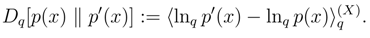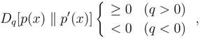 with equality if and only if p(x) = p′(x) for all x ∈ and D0[p(x) ‖ p′(x)] = 0. The positivity in the case of q > 0 can be considered a necessary property to develop the information theory.