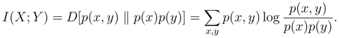 To capture and elucidate the present problem clearly let us review the usual mutual information by Shannon. The mutual information can be defined as the relative entropy between the joint probability distribution p(x, y) and the product of the two probability distributions p(x)p(y). That is, we can regard that the mutual information is a marker how far the joint probability deviates from the independence of the two i.e.,
