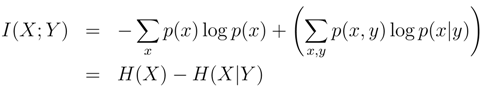 Hence the mutual information is symmetric in X and Y , I (X; Y ) = I (Y ; X). Moreover its positivity can be proved. Here, the most remarkable feature associated with the later discussion is the fact that we can rewrite the I (X; Y ) from Eq.(13) as