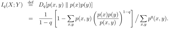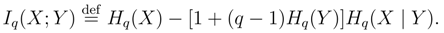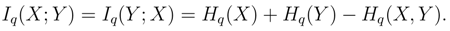Therefore we can take the definition of the mutual information either as H(X) − H(X | Y ) or as D[p(x, y) ‖ p(x)p(y)]. However, the situation totally differs in the context of the generalized mutual information. More specifically, the definition by the generalized KL entropy Dq[p(x, y) ‖ p(x)p(y)] [18] does not give the expression Hq(X) − Hq(X | Y). Accordingly we need to determine which standpoint we take as the definition.