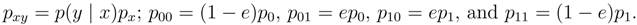 In BSC we have the alphabet = {0, 1}. The input code x of 0 and 1 can be received as a 1 and a 0 of the output code y respectively with the error probability e due to the external noise[22]. Then the conditional probabilities p(y | x) are given as p(0 | 1) = p(1 | 0) = e and p(0 | 0) = p(1 | 1) = 1 − e respectively. If we write the input (output) probability which we observe a 0 and a 1 as p0 and p1 ( and ) respectively, then we have the joint probabilities