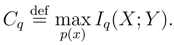 . Since the maximization of Iq(X; Y ) can be achieved when p0 = p1 = 1/2 as in the previous definition, we can calculate Cq as