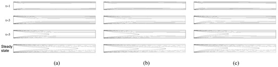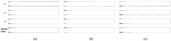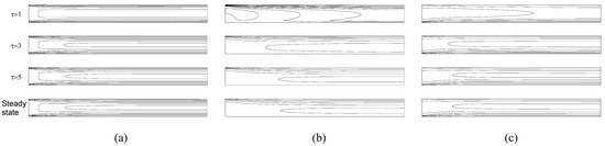 Transient change in the contours of isotherms from τ=1 up to steady-state for the cases of lower plate as a) stationary, b) moving in parallel and c) inverse direction to the flow (Re=100).
