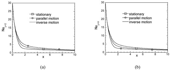 Local Nusselt numbers in the channel for a) lower and b) upper plate at steady-state.