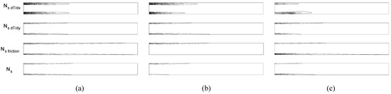 Figure 6 demonstrates the partitioning of the number of entropy generation according to the sources of irreversibilities. The contours of Ns dT/dx account the entropy generation due to the axial conductive heat transfer. The contours of Ns dT/dy represent the entropy generation due to the heat transfer in normal direction. The entropy generation values calculated from the terms in the second bracket on the RHS of the Eq.(7) illustrate the contribution of fluid friction, Ns friction which is presented at the third line of the Fig.6. The contours of Ns friction stretch along the inside surface of the upper and the lower plates in the similar manner with the velocity contours. The Ns friction values are very small under the present conditions. At the last lines of the Fig.6 (a), (b), and (c), the contours of the total value of the entropy generation number are given. Their values, the last line of the Fig.6, is much the same with the results shown in the second line.