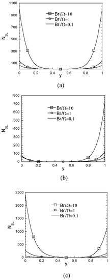 Figure 7 summarizes the effect of Br/Ω on the problem considered. It is seen that an increase in the Brinkman number which determines the relative importance between dissipation effects and fluid conduction yield strong increase in the entropy generation number. The relative motion of the lower plate with respect to the upper plate causes a deviation from the symmetric structure of NSL. The shifted profile through upper plate is obtained in the case of parallel motion. The highest values of the number of entropy generation are realized in the last case.