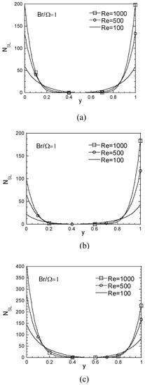 Figure 8 is prepared to show the effect of Reynolds number on the entropy generation during the developing flow under consideration. Three values of the Reynolds number 102, 5x102, and 103 are considered for Pr=1 and Br/Ω =1. The number of the entropy generation increases with increasing Reynolds number. The strong effect of Re number is realized on the inside surfaces of the channel plates. In Fig.8a, the symmetric distribution is clearly observed at the fixed channel case. The parallel motion of the bottom plate not only reduced the highest NSL value but also decreased the entropy generation on the upper plate (Fig 8b) with respect to fixed case. It is seen in Fig.8c the highest value of NSL is obtained at the highest Re number on the surface of the lower plate moving in counter direction to the flow.