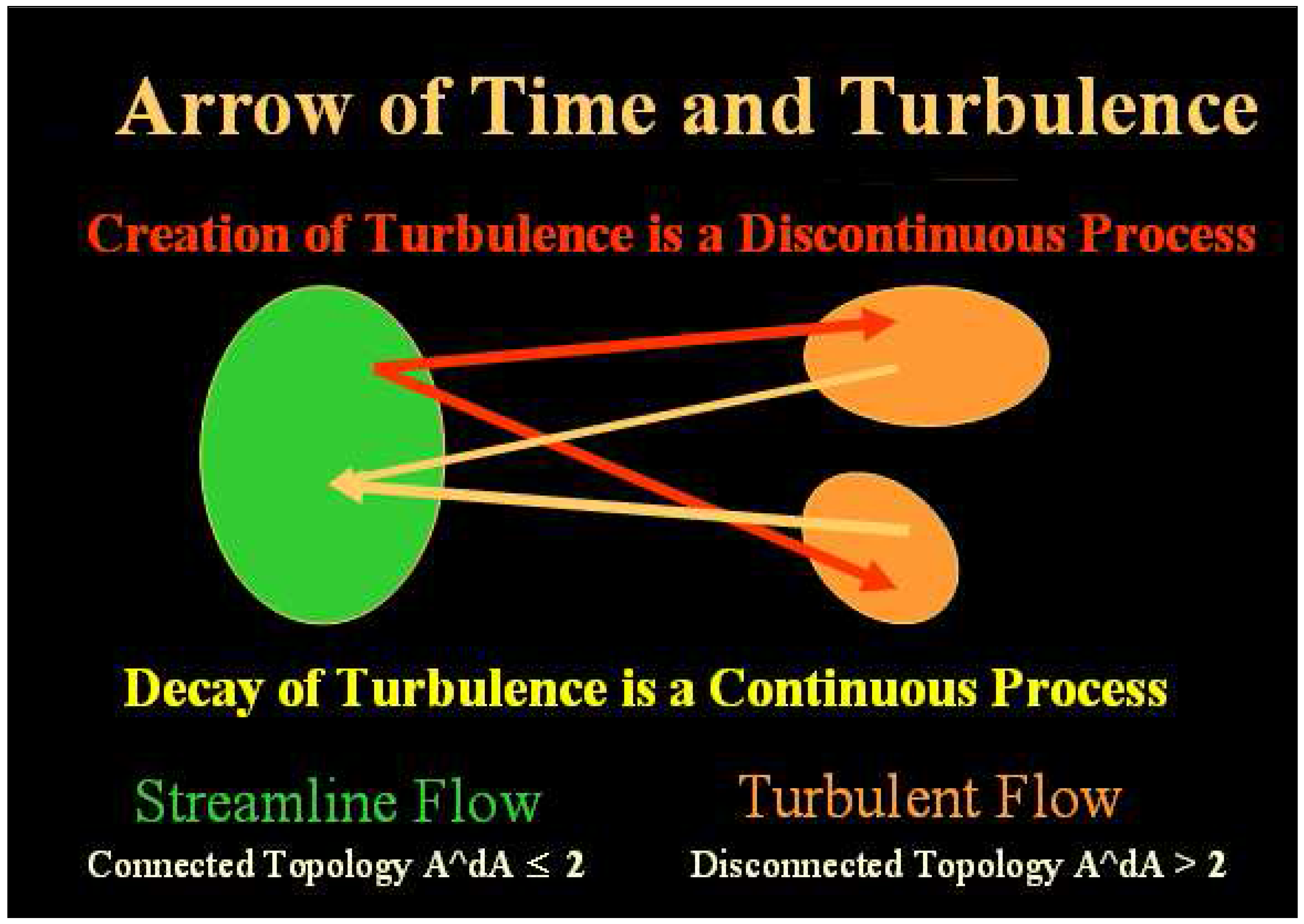 Warning! The topology of interest to this article is that generated by Cartan’s Topological structure based on a 1-form of Action, A, and Cartan’s theory of exterior differential forms [2]. The Cartan topology is NOT a metric topology, NOT a Hausdorf topology, and even does NOT satisfy the separation axioms required to be a T1 topology [22]. Yet all of the pertinent topological ideas, including the non-intuitive ones, are easy to grasp from the simple example of the T4 point set topology. Of utmost importance, for physical systems of topological dimension greater than 2, is the fact that the Cartan topology is not a connected topology. This idea implies that such systems are topologically inhomogeneous. As will be discussed below, when the topological dimension is greater than 2, the physical system is a non-equilibrium physical system. Non-equilibrium systems are a consequence of a disconnected topology. Irreversible processes are artifacts where the Pfaff topological dimension is ≥ 4. The importance of this result resides with the topological theorem that mappings from a disconnected topology to a connected topology can be continuous, but continuous maps from a connected topology to a disconnected topology are impossible. In other words continuous maps can be used to describe the irreversible decay of a Turbulent state, but not its creation [14].