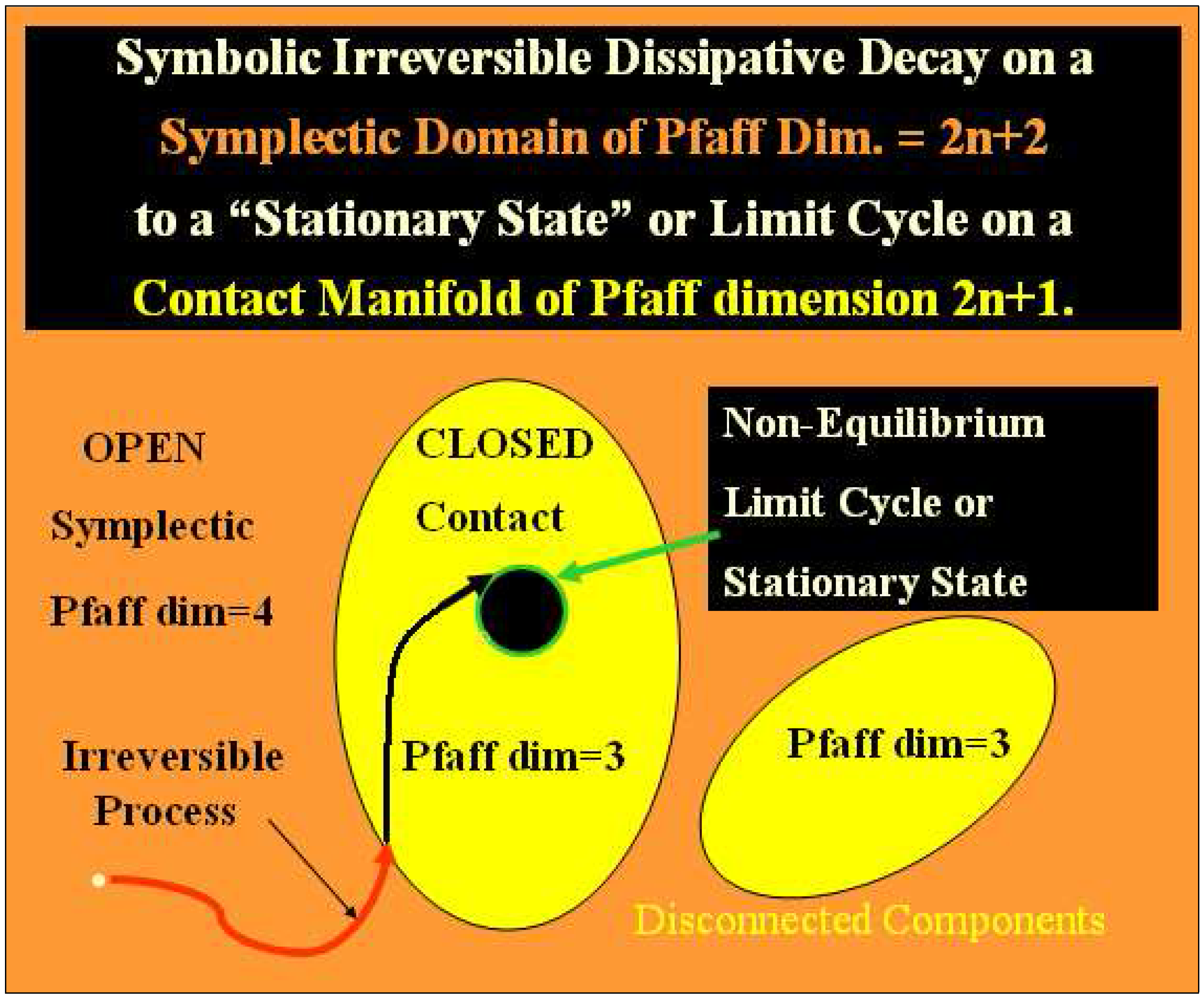 If the divergence of the topological torsion tensor is zero, then the Pfaff topological dimension of such a domain is not even. The domain no longer has a symplectic structure, but the does admit a contact structure. It is noteworthy fact that the contact structure (a non-equilibrium state space of odd topological dimension > 2 ) does support "stationary" states in a Hamiltonian sense. This result lends credence to the Prigogine conjecture of "stationary states far from equilibrium". Such "excited - stationary" states are far from equilibrium, for their Pfaff dimension is greater than 2. These excited states represent self organized topologically coherent complexes which are representative of the topological inhomogeneities in the thermodynamic system. On a state space of topological dimension 2n+1 embedded in a space of topological dimension, 2n+2, the topological torsion vector is not zero, but has a zero divergence. Evolution in the direction of the divergence free topological torsion vector is no longer thermodynamically irreversible. In fact, the topological torsion vector represents a characteristic process which is both extremal and associated, in the sense of the calculus of variations, and can be related to Hamilton-Jacobi theory.