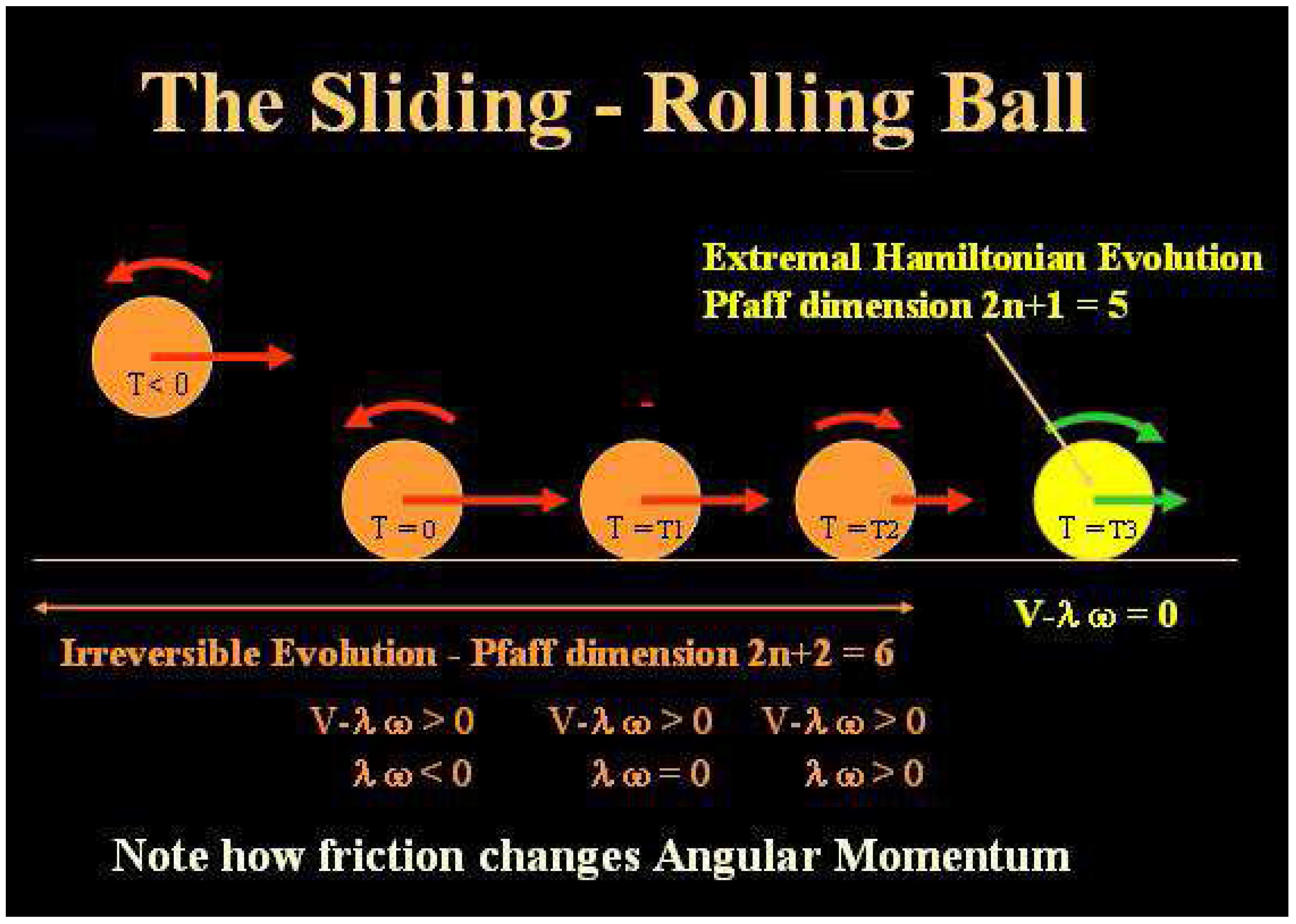 Consider a bowling ball given an initial amount of translational energy and rotational energy. Assume the angular momentum and the linear momentum are orthogonal to themselves and also orthogonal to the ambient gravitational field. Then place the bowling ball, subject to these initial conditions, in contact with the bowling alley. Initially, it is observed that the ball slips or skids, dissipating its linear and angular momentum, until the No-Slip condition is achieved. Note that it is possible for the angular momentum or the linear momentum to change sign during the irreversible phase of the evolution. The dynamical system representing the evolutionary process is irreversible until the No-Slip condition is reached. Thereafter, the dynamical system is reversible, and momentum is conserved.