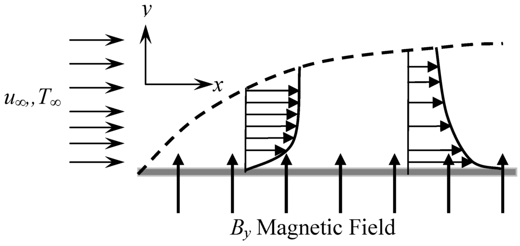 Consider the two-dimensional steady, laminar MHD forced convection flow of an electrically conducting, incompressible, Newtonian fluid over an isothermal plate in the presence of a transverse magnetic field (By) applied normal to the flow direction. A schematic diagram of the problem under consideration is shown in Figure 1. The fluid is assumed to be incompressible with constant properties. The non-dimensional equations for steady state two-dimensional laminar MHD force convection over a flat plate are given by []