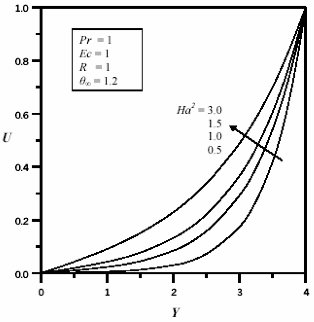 Figure 2 shows the dimensionless velocity distributions at different values of Hartmann number (Ha). It is clear that, increase the value of (Ha) have a tendency to slow down the fluid motion. This is because the presence of the transverse magnetic field creates a resistive force similar to the drag force that acts in the opposite direction of the fluid motion, thus causing the velocity of the fluid to decrease. As expected, increasing (Ha) causes the fluid to become warmer and therefore increase its temperature as shown in Figure 3. This behavior is attributed to decrease of the fluid velocity due to the magnetic field.