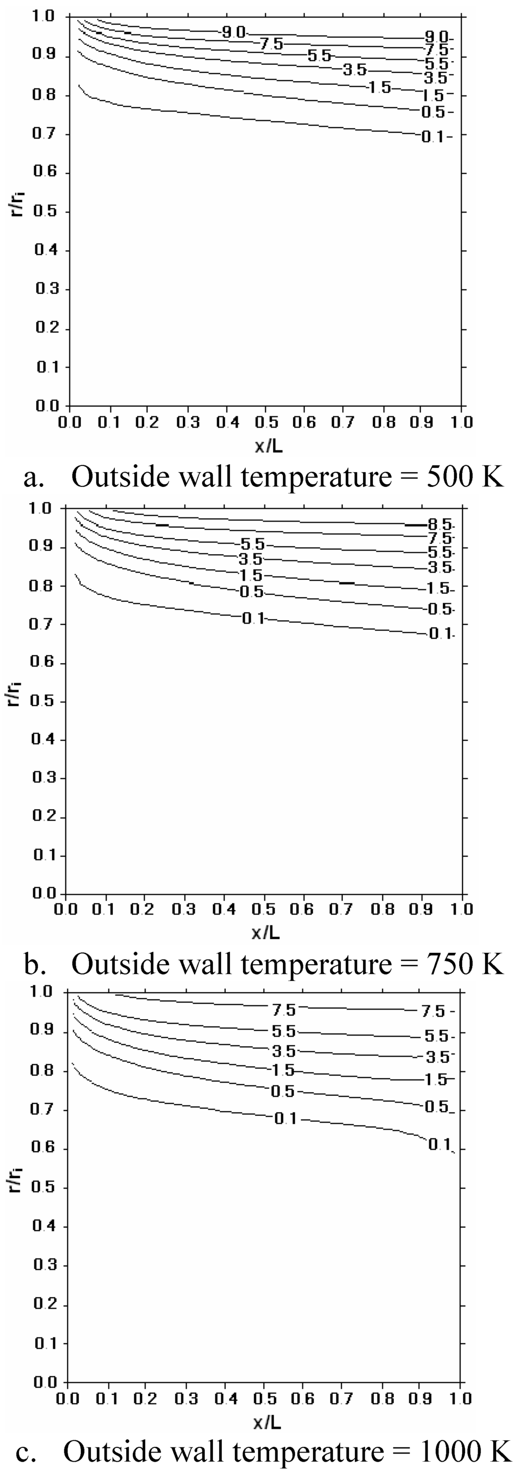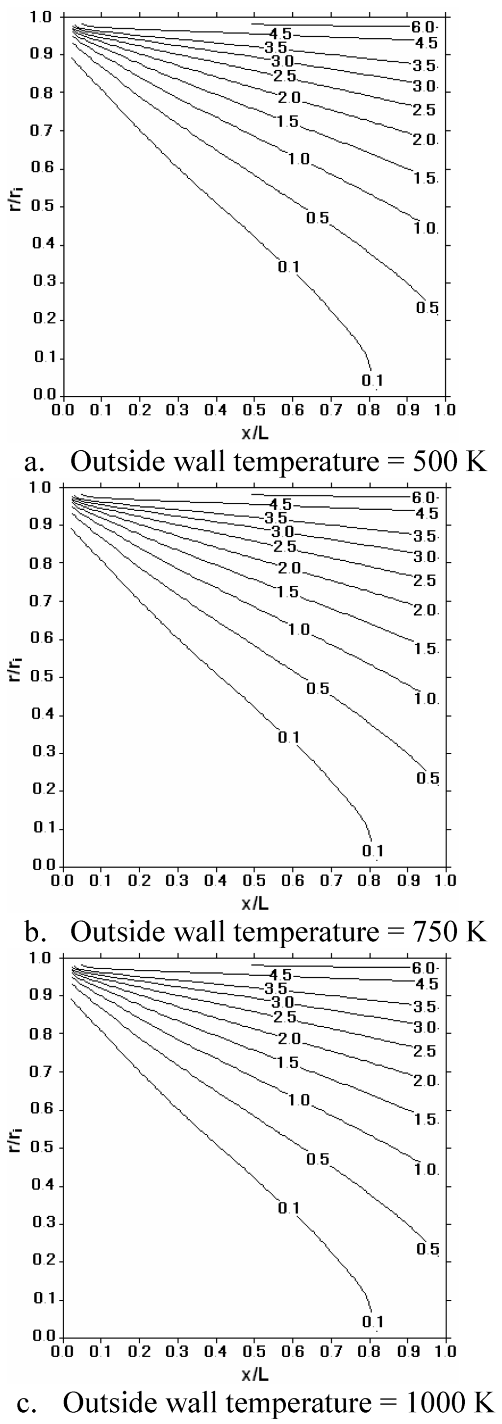 Figure 5 shows temperature contours due to variable viscosity case for three outer pipe wall temperatures. As the wall temperature increases, temperature contours expand towards the fluid bulk, which is more pronounced towards the pipe exit. This is because of the convective heat transfer from the pipe wall to the fluid. Moreover, the influence of variable viscosity on the temperature contours is significant, which can be observed after comparing figure 3 and figure 5. In this case, heating of the fluid in the region close to the wall is more pronounced for variable viscosity case. Consequently, increasing fluid temperature close to the pipe wall reduces the fluid viscosity, which in turn lowers the heat transfer in the fluid towards the symmetry axis.