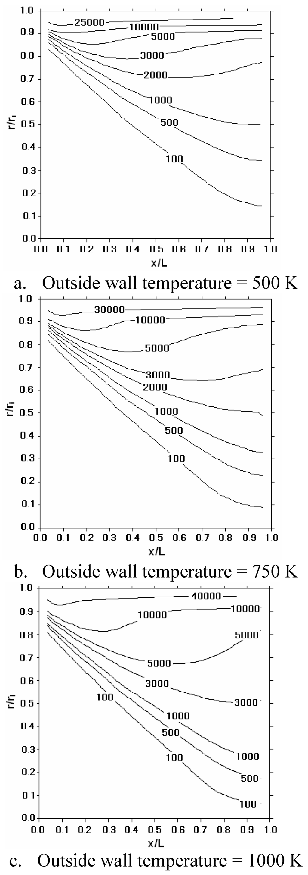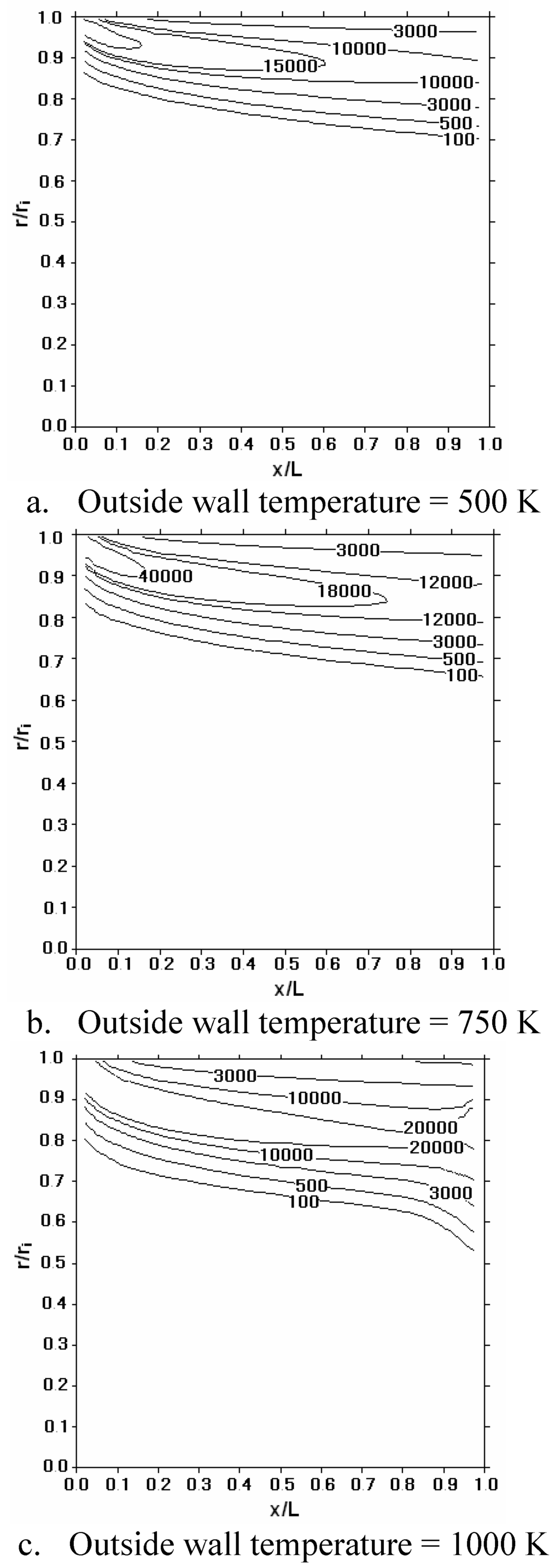 Figure 4 shows entropy contours for constant viscosity case and different pipe wall temperatures. Entropy generation is high in the region close to the pipe wall, which is due to the attainment of high temperature gradients in this region, i.e. high temperature gradient results in high entropy generation rate (equation 10). It should be noted that entropy generation rate due to fluid friction is lower than that due to heat transfer [19]. Entropy contours extends towards the symmetry axis at the pipe exit. In this case, entropy contours follow almost the temperature contours in the fluid. Entropy contours close to the pipe wall change considerably for different pipe wall temperatures. This is because of the different magnitude of temperature gradient developed in this region.