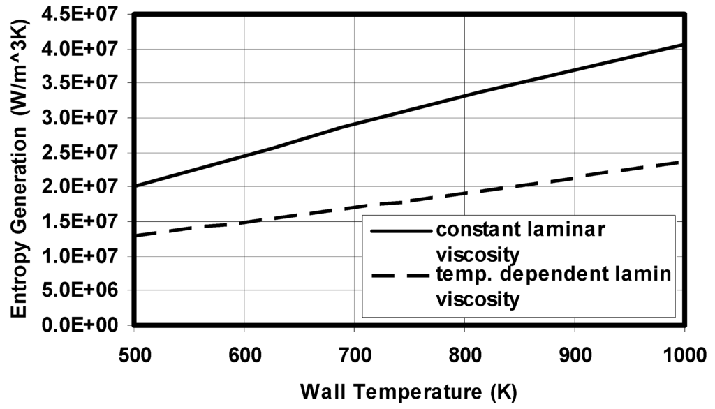 Figure 7 shows rate of entropy generation in the fluid with pipe wall temperature for constant and temperature dependent viscosity cases. In general, increasing pipe wall temperature enhances the rate of entropy generation in the fluid. Although entropy generation rate attains high values in the region close to the pipe wall for the variable viscosity case, the total entropy generation is lower than that corresponding to constant viscosity case. This is because of the extension of the high temperature gradient in the fluid, i.e. temperature gradient is high in the region close to the wall for variable properties case; however, high temperature gradient region extends further into the fluid for the constant viscosity case.