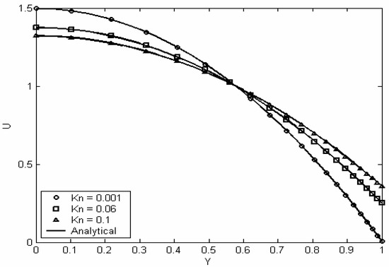 The numerical solution is validated by comparing the obtained numerical results with the analytical solution of the special case when the left hand side of equations (1-2) is negligible at different values of Knudsen Number. The analytical solution for this case is obtained as: