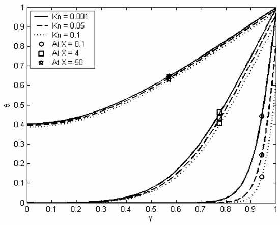 Figure (5) shows the development of the spatial fluid temperature distribution along the channel transverse direction and at different Knudsen numbers. From this figure it can be noted that as Knudsen number increases, the nondimensional temperature (θ) profiles shift down. This is due to the increase in temperature jump at the wall (i.e. less heat is transferred from the wall to the adjacent fluid). The figure also shows that the temperature jump is a maximum at the entry region of the channel. Within the entry region, the heat transfer rate is high and the temperature gradient is large. This in turns forces the temperature jump at the wall of the entry region to increase. However, as (X) increases, dissipation effect becomes more significant and this leads to a reduction in temperature jump at the wall.