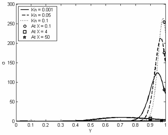 Spatial distribution of the local entropy generation profiles at different axial locations and at different Knudsen numbers: Re = 200, Pr = 0.7, Ec = 0.01, σv = 0.7, σT = 0.7, γ = 1.4.