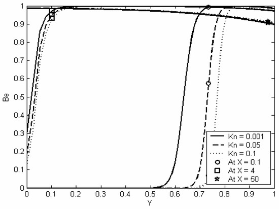 Figure (7) shows the spatial distribution of Bejan number within the channel at different axial locations and at different values of Knudsen numbers. This figure shows that Bejan number has large values near the wall, which means that near the wall most of the entropy is generated due to heat transfer. This is attributed to the high temperature gradient near the wall and the low temperature of the fluid. Also, from Figure 6 and Figure 7 one may conclude that at the entry region most of the entropy is generated due to heat transfer. Figure (7) shows that as Knudsen number increases, Bejan number decreases. This is attributed to the decrease in the temperature gradient as Knudsen number increases which in turns causes a decrease in the thermal part of the entropy generation and hence causes a decrease in Bejan number.