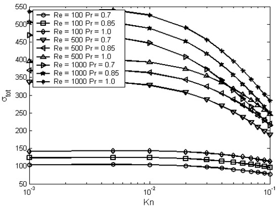 The total entropy generation as function of Knudsen number and for different values of Reynolds and Prandtl numbers: Ec = 0.01, NDT = 4, σv = 0.7, σT = 0.7, γ = 1.4.