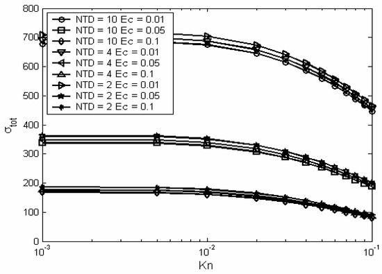 Figure (9) shows the total entropy generation as a function of Knudsen number and at different values of nondimensional temperature difference and Eckert numbers. The figure shows that as the nondimensional temperature difference increases the entropy generation increases. This is due to the increase in the driving temperature difference that would result in an increased temperature gradient and thus increased entropy generation from heat transfer. This effect (i.e. effect of NTD on σ) is mathematically obvious in equation (11). In addition, Figure (9) shows that as Eckert number increases the entropy generation increases. This can be attributed to the increase in temperature gradient as Eckert number increases. Mathematically, the effect of (Ec) on (σ) is obvious in equation (7 and 11).