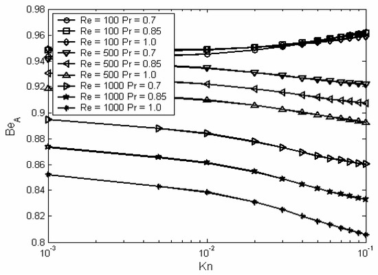 Figure (10) shows the average Bejan number as function of Knudsen number and at different values of Reynolds and Prandtl numbers. This figure shows that at high values of Reynolds number, as Knudsen number increases the average Bejan number decreases, whereas at low values of Reynolds number, as Knudsen number increases the average Bejan number increases. This behavior with Knudsen number can be attributed to two contradicting reasons: (1) The decrease in temperature gradient due to the increase in Knudsen number which in turn causes the average Bejan to decrease, (2) The decrease in velocity gradient due to the increase in Knudsen number which in turn causes the average Bejan number to increase. At low Reynolds number the effect of the decrease in velocity gradient compensate the effect of the decrease in temperature gradient. But at high Reynolds number the effect of the decrease in temperature gradient compensate the effect of the decrease in velocity gradient. Also, Figure (10) shows that as Reynolds number increases the average Bejan number decreases. This is attributed to the increase in the thermal and hydrodynamic entry lengths due to the increase in Reynolds number. It is known that as the hydrodynamic and the thermal entry lengths increase, the local velocity and temperature gradients and the local temperature distributions decrease. The decrease in local velocity gradient and local temperature cause the local Bejan number to increase. But, the decrease in local temperature gradient causes the local Bejan number to decrease. The effect of the reduction in local temperature gradient on the local Bejan number dominates over the other effect and so the average Bejan number decreases as Reynolds number increases. Figure (10) shows also the effect of Prandtl number on the average Bejan number. This figure shows that as Prandtl number increases the local entropy generation decreases. This can be attributed to the increase in thermal entry length as discussed previously. But, as Prandtl number increases the temperature jump decreases and this causes an increase in both the local temperature gradient and the local temperature distributions. These two effects lead to an increase in the local Bejan number.