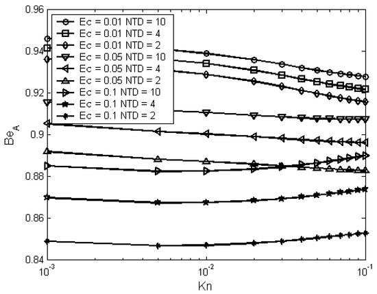 Figure (11) shows the variation of the average Bejan number as function of Knudsen number at different values of Eckert number and nondimensional temperature difference. At low values of Eckert number, this figure shows that as Knudsen number increases the average Bejan number decreases. This is because the entropy generation due to heat transfer decreases faster than that due to viscous dissipation and thus the net effect is to decrease Bejan number. On the other hand, at high values of Eckert number, as Knudsen number increases the average Bejan number increases. This is because the entropy generation due to dissipation decreases at much faster rate than that due to heat transfer and thus the net effect is to increase Bejan number. Also, Figure (11) shows that the average Bejan number decreases as Eckert number increases. This is attributed mainly to the decrease in the entropy generation due to heat transfer with the increase in Eckert number. Furthermore, figure (11) shows that as the nondimensional temperature difference decreases the average Bejan number decreases. This is related to the reduction in entropy generation due to heat transfer since heat transfer is reduced as the NTD is decreased.