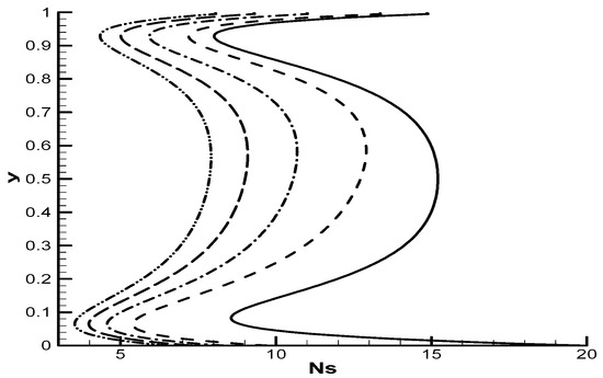Figure 6, Figure 7, Figure 8, Figure 9 and Figure 10 illustrate the dimensionless entropy generation rate, Ns, for some values of s and Br while in all figures the values of Pe and Ω are fixed to 10 and 1, respectively. As a common trend in all figures one comprehends that the entropy generation rate decreases from the channel inlet to the outlet due to a fall in temperature gradients and this plunge is associated with a decrease in the heat transfer irreversibility term. As seen, for small values of s the plots of Ns experience a minimum while for large values of s one observes two local minima. For large values of s, the velocity changes in a thin region adjacent to the walls and this is accompanied by a steep temperature gradient near the bottom wall leading to a local maximum for Ns that happens near the bottom wall. Though near the upper wall the temperature gradients are small, Ns reaches a local maximum for a decrease in the temperature appearing in the denominator of Ns. Ns is defined here similar to Bejan [13], without the assumption that temperature difference in a cross-section is small, as