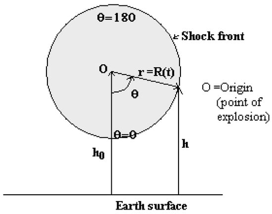 The explosion causes an immediate production of a spherical blast wave which propagates with a velocity U. At any time t, the radius of the spherical shock front is given as r=R (t). Variable θ represents the direction, which is taken as zero (θ=00) towards the earth surface and is 1800 in the vertical direction.