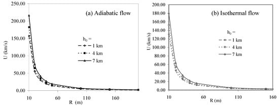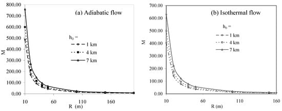 The plots in Figure 2 and Figure 3 show the effect of height of explosion on the shock strength M and shock velocity U. Figure 2a,b shows the variation of shock strength (M) with propagation distance (R) for the adiabatic and isothermal flow respectively, at different heights of explosion h0 (=1km, 4km and 7km), as the shock moves in the horizontal direction (θ=900). Corresponding variation of shock velocity (U) with propagation distance (R), for the two cases, are shown in Figure 3a,b.