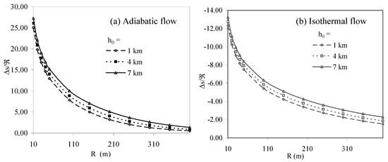 Variation of entropy production (Δs/ℜ) in different directions (entropy profiles) at the height of explosion h0=7 km and at the propagation distances (a) R=10m (b) R=20m (c) R=30m.