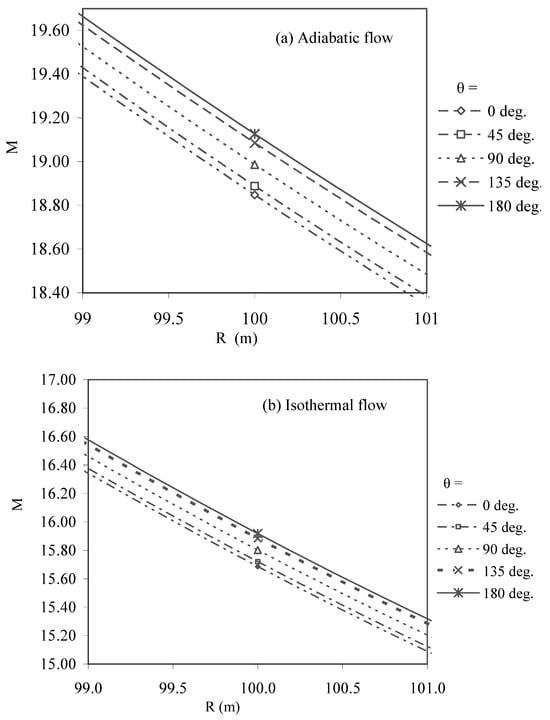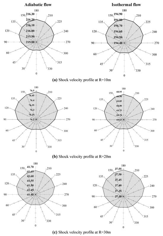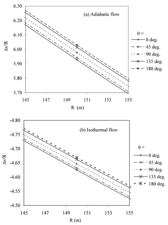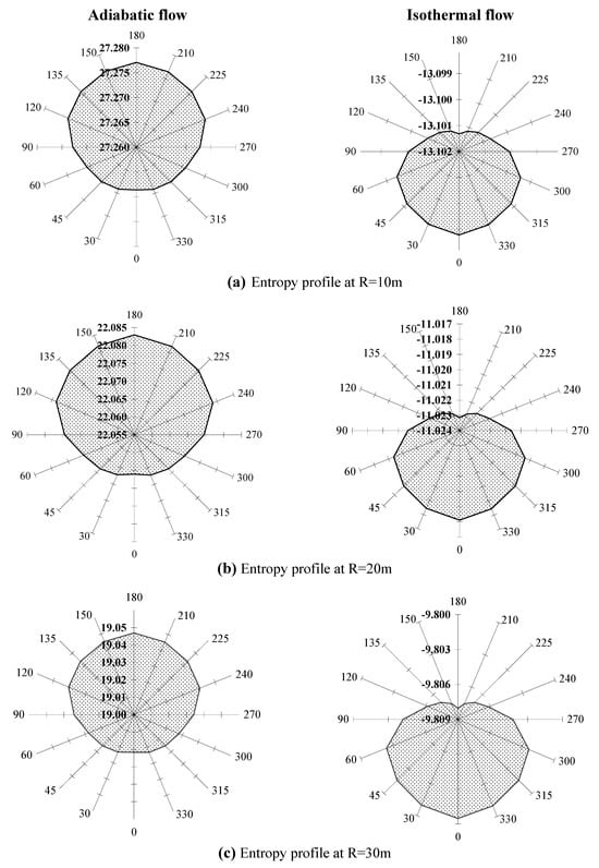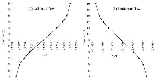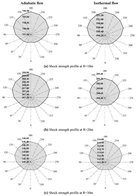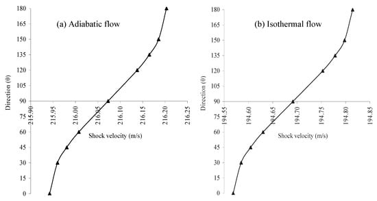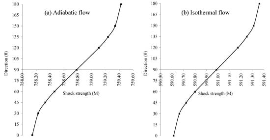 For adiabatic flow, the profiles of entropy production Δs/ℜ, given in Figure 13(a, b and c) show a smooth variation with direction, with the highest value in vertical upward direction and the lowest value in vertical downward direction, forming an oval shape. Whereas, for isothermal flow, the profiles of entropy production Δs/ℜ, show a smooth variation with direction, with the lowest value in vertical upward direction and the highest value in vertical downward direction, forming an oval shape. The profiles maintain their shape as the shock moves forward.